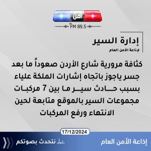 وحول أهم البلاغات التي تم التعامل معها خلال الأربع والعشرين ساعة الماضية بين ضابط غرفة عمليات الدوريات الخارجية أن أبرز ما تم التعامل معه حادث تدهور مركبة على الطريق الصحراوي ما بعد منطقة السلطاني باتجاه عمان ونتج عن الحادث 3 إصابات متوسطة تم نقلها بواسطة الدفاع المدني إلى مستشفى الكرك الحكومي ، وتم تعليل أسباب الحوادث بتغيير المسرب بشكل مفاجئ واتخاذ مسرب خاطئ ، ونوه إلى بدء الجهات المختصة بعمل صيانة على طريق المطار “من مدخل الجيزة لغاية جسر المطار / حيث تم تحويل حركة السير على طريق الخدمات حيث تم الانتهاء من عملية القشط وبانتظار عملية التعبيد والدوريات بالموقع للدلالة والإرشاد .