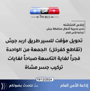 قررت مديرية أشغال محافظة جرش تحويل مؤقت للسير على طريق اربد جرش-عمان (تقاطع كفرخل) يوم غد الجمعة من الساعة الواحدة فجرا إلى الساعة التاسعة صباحا لغايات تركيب جسر مشاة.