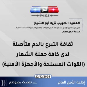 وبين أنه وخلال جائحة كورونا بقيت المستشفيات تعمل وبنك الدم لا بد أن يعمل في خلال العمليات الطارئة والحوادث والمرضى الموجودين في الأقسام من هنا لا نستطيع نسيان فضل القوات المسلحة – الجيش العربي ومديرية الأمن العام خلال جائحة كورنا وهو الذي حافظ على مخزون بنك الدم وأدامت العمل في بنك الدم بشكل كامل ولم ينقطع عن أي مريض وكان هذا جهد من نشامى القوات المسلحة والأمن العام وكافة الأجهزة الأمنية .