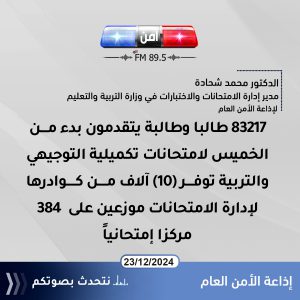 وأوضح أن الوزارة نشرت على مواقع التواصل وصفحاتها ، الإرشادات التي تتعلق بالامتحان ومن أهمها ضرورة تواجد الطلبة في قاعات الامتحان قبل نصف ساعة على الأقل قبل بدء الامتحان مؤكداً أن الوزارة حرصت في فصل الشتاء على تأجيل الجلسة الأولى حتى الساعة الحادية عشرة صباحا تحسباً من أي ظروف جوية طارئة قد تحصل مشيراً إلى أن هناك ثلاثة أيام يكون فيها جلسة ثانية تكون الساعة الثانية مساءاً