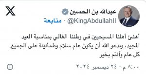 وقال جلالته عبر منصة “أكس”: “أهنئ أهلنا المسيحيين في وطننا الغالي بمناسبة العيد المجيد، وندعو الله أن يكون عام سلام وطمأنينة على الجميع. كل عام وأنتم بخير”.