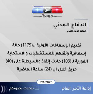 الدفاع المدني لإذاعة الأمن العام : تقديم الإسعافات الأولية ل(1179) حالة إسعافيه ونقلهم للمستشفيات والاستجابة الفورية لـ (103) حادث إنقاذ والسيطرة على (40) حريق خلال ال (24) ساعة الماضية.