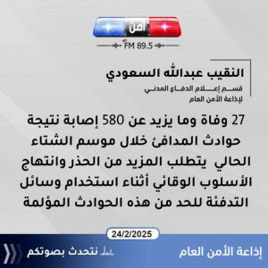 ((27)) وفاة وما يزيد عن ((580)) إصابة نتيجة حوادث المدافئ خلال موسم الشتاء الحالي يتطلب المزيد من الحذر وانتهاج الأسلوب الوقائي أثناء استخدام وسائل التدفئة للحد من هذه الحوادث المؤلمة