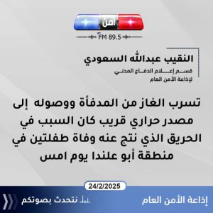 عمان 24 شباط (أمن إف إم ) – قال النقيب عبدالله السعودي من قسم إعلام الدفاع المدني إنه تم بالأمس التعامل مع حادث حريق اندلع في منطقة أبو علندا داخل إحدى الشقق السكنية ونتج عن الحادث وفاة طفلتين شقيقتين , نتيجة تعرضهن لحروق بالغة في الجسم حيث عملت طواقم الإطفاء التابعة لمديرية دفاع مدني شرق عمان على إخماد الحريق وكان سبب الحريق تسرب الغاز ووصول النار إلى مصدر حراري حيث كانت المدفئة قريبة من مصدر حراري مناسب ما أدى إلى اشتعال النيران داخل المنزل .
