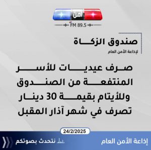 صرف عيديات للأسر المنتفعة من الصندوق وللأيتام بقيمة 30 دينار تصرف في شهر آذار المقبل.