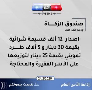 إصدار 12 ألف قسيمة شرائية بقيمة 30 دينار و 5 آلاف طرد تمويني بقيمة 25 دينار لتوزيعها على الأسر الفقيرة والمحتاجة