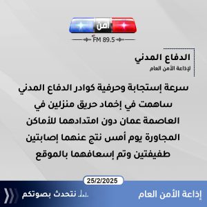 عمان 25 شباط (أمن إف إم )- استعرض ضابط إعلام الدفاع المدني النقيب عبدالله السعودي الجهود التي بذلت خلال الساعات الماضية والتي تمثلت بالتعامل مع (1397) حالة إسعافية لأشخاص بمواقعهم وتأمين وصولهم إلى المستشفيات والاستجابة الفورية لـ (71) حوادث إنقاذ والسيطرة على (46) حريق .