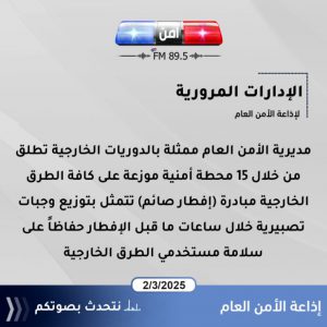 من جانبه قال ضابط عمليات الدوريات الخارجية إن مديرية الأمن العام وتجسيدا للواجب الإنساني الذي لا يقل أهمية عن أي واجب من واجبات مديرية الأمن العام ومن خلال إدارة الدوريات الخارجية وحرصا على سلامة مرتادي الطرق الخارجية، تم إطلاق مبادرة تتمثل بتوزيع وجبات تصبيريه خلال ساعات ما قبل الإفطار (ساعات ما قبل الغروب) من خلال 15 محطة أمنية على امتداد الطرق الخارجية للمواطنين بالتزامن مع مرور المواطنين المحطات المذكورة تجنبا لارتكاب المخالفات الخطرة في أوقات الصيام وأبرزها مخالفات السرعات العالية.