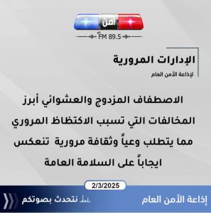 ودعا مندوبا إدارتي السير والدوريات الخارجية السائقين إلى الالتزام بقواعد وأولويات المرور والابتعاد عن المخالفات الخطرة للمحافظة على انسيابية حركة السير وللمحافظة على سلامتهم وسلامة مستخدمي الطريق، وعدم التردد بالاتصال على رقم الطوارئ الموحد 911 إذا دعت الحاجة إلى ذلك مؤكدين الجاهزية التامة لتقديم المساعدة لمحتاجيها على خلال الأربع وعشرين ساعة