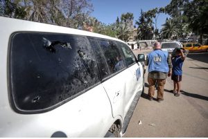 وأشارت مصادر فلسطينية، الى أن طائرات الاحتلال قصفت مقرا للأمم المتحدة في دير البلح، ما اسفر عن مقتل احد الموظفين الدوليين وإصابة خمسة آخرين.