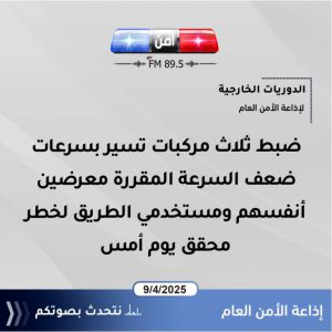 وبين انه تم التعامل مع عدد من المخالفات الخطرة أبرزها ،، ضبط مركبة تسير بسرعة من 90- 183 كلم بالساعة على طريق الأزرق الزرقاء وتم إجراء اللازم ، كما تم ضبط مركبة على الطريق الصحراوي “منطقة سطح معان ” تيسير بسرعة من 80-160 كلم بالساعة ، وعلى طريق دبة حانوت تم ضبط مركبة تسير بسرعة 80-169 كلم بالساعة وتم إجراء اللازم .