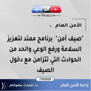 باشرت مديرية الأمن العام، ومنذ الأسبوع الماضي، تنفيذ مبادرة “صيف آمن”، التي وجّه مدير الأمن العام، اللواء الدكتور عبيدالله المعايطة، بإطلاقها، بهدف تعزيز السلامة العامة، ورفع مستوى الوعي لدى المواطنين والمقيمين، والحد من الحوادث التي تتزامن مع فصل الصيف، مثل الغرق والحرائق ولدغات الزواحف، والتعديات البيئية.