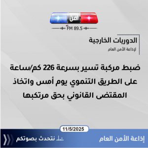 وأشارا في حديثهم لإذاعة الأمن العام إلى أبرز المخالفات المرورية التي تم التعامل معها نهاية الإسبوع وشكلت خطورة واضحة على مرتكبيها ومستخدمي الطريق وكان أبرزها تحميل الركاب في الصندوق الخلفي لمركبات الشحن أثناء رحلات التنزه والاصطفاف العشوائي والمزدوج أمام المجمعات التجارية والطبية والالتفاف من اماكن غير مخصصة على الطرق الخارجية وتجاوز السرعات المقررة حيث تم ضبط مركبة كان سائقها يقودها بسرعة 226كم/ساعة على الطريق التنموي وتم اتخاذ المقتضى القانوني بحق مرتكبها.