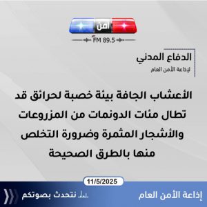 وفي محافظة جرش “منطقة المسطبة ” تم إخماد حريق أعشاب جافة بمساحة 25 دونم والسيطرة عليه ومنع امتداده دون وقوع أي إصابات بالأرواح .