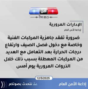 وأكد أن المواطن شريك في العملية المرورية ودائما نعول على وعي المواطنين للقيام بتفقد مركباتهم من الناحية الفنية قبل الانطلاق إلى وجهاتهم المختلفة مشيرا إلى أنه تم التعامل خلال الـــ24 ساعة الماضية مع عدد من المركبات المعطلة بسبب ارتفاع درجات الحرارة.