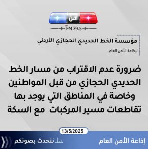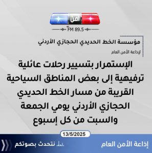 وأشار في حديثه لإذاعة الأمن العام إلى أهمية وعي المواطنين بأهمية هذا النوع من أنواع النقل في الأردن الذي يقدم الخدمة بطريقة شبه مجانية لأن مؤسسة الخط الحديدي الحجازي الأردني هي مؤسسة وقفية لا تسعى للربح وهدفها الرئيسي إيصال أكبر عدد من المشاركين في الرحلات إلى مواقع سياحية لم تطرق في السابق داعيا المواطنين مستخدمي وسائل النقل المختلفة خصوصا التي يوجد بها تقاطعات مع السكة إلى اخذ الحيطة والحذر أثناء القيادة .