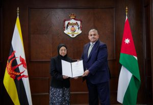تسلم أمين عام وزارة الخارجية وشؤون المغتربين، السفير ماجد القطارنة، اليوم ، نسخة من أوراق اعتماد سفيرة بروناي دار السلام الشقيقة، نور هدى أحمد، سفيرا معتمدا مقيما لدى المملكة.