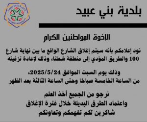 نود إعلامكم بأنه سيتم إغلاق الشارع الواقع ما بين نهاية شارع 100 والطريق المؤدي إلى منطقة شطنا